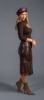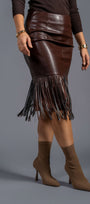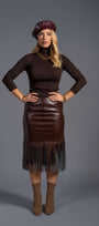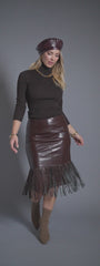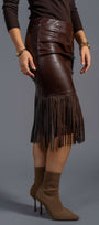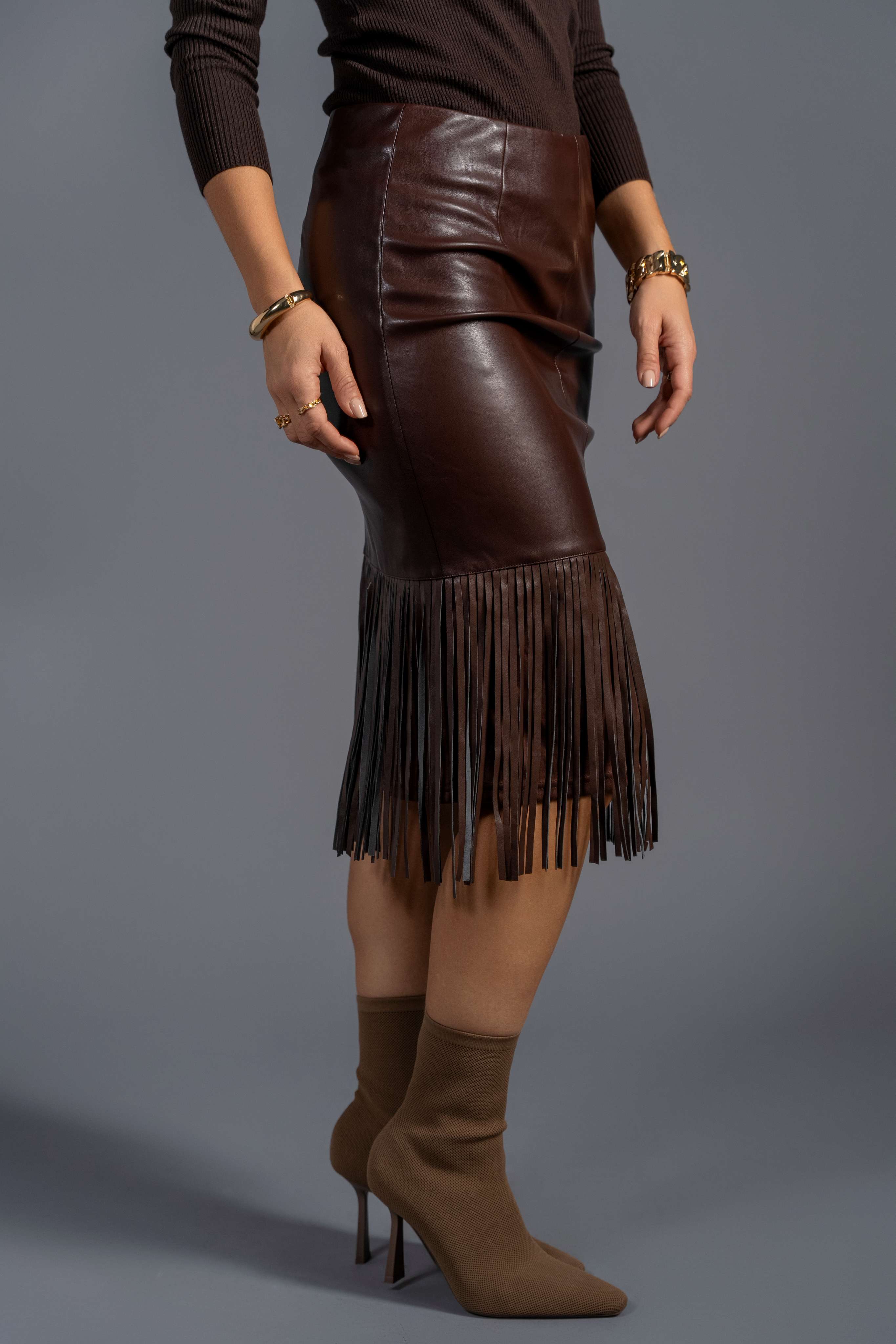 The Brownstone Belle Skirt redefines modern edge, structured yet untamed. Crafted from supple vegan leather in deep brown, its fringe moves like momentum itself, alive with energy. Confident, magnetic, and unapologetically bold: it’s a statement of strength in motion.