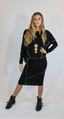 Pencil skirt with geometric pattern cut and lurex stitching.