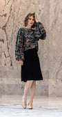 A soft A line skirt to complete the Haya set. A perfect match for a dramatic top. Skirt has a side invisible zipper and elastic top for comfort.