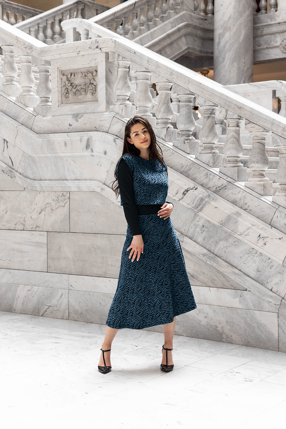 Matching to the Sora skirt, the Kumi vest completes the outfit, elevating it and making the complete look. Stunning with a turtle neck or a fitted top.