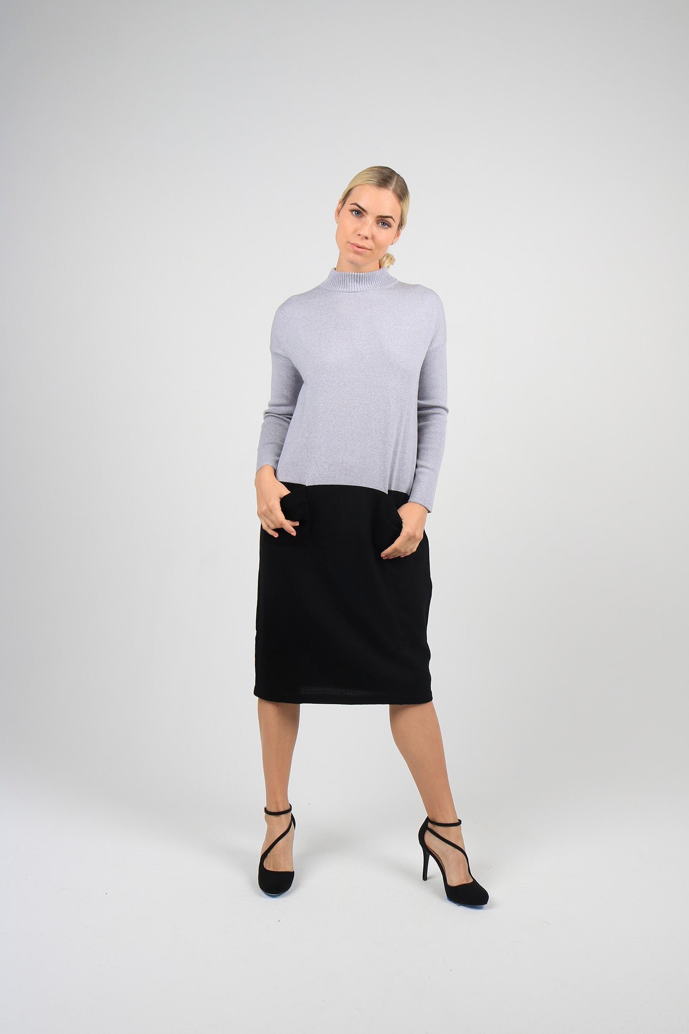 Two tone sweater dress with pockets. Please note that the collar is crew neck and not as pictured