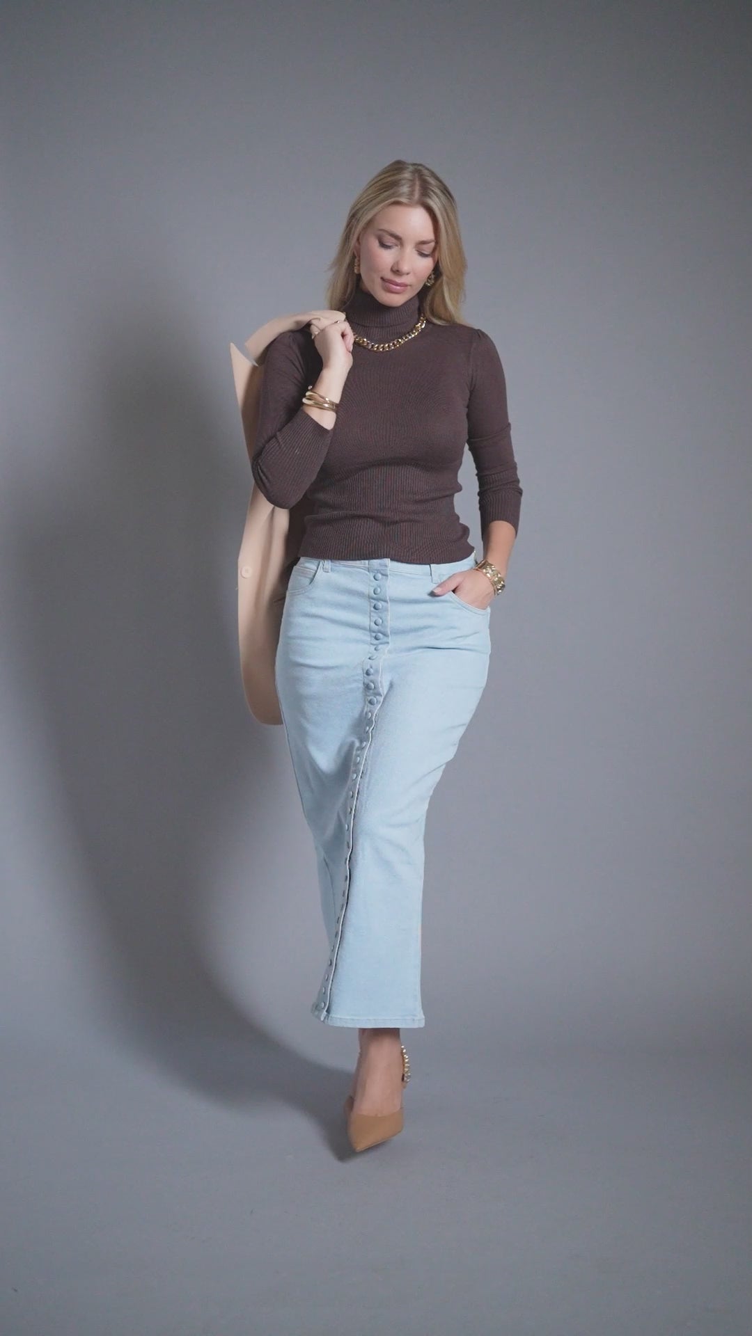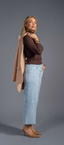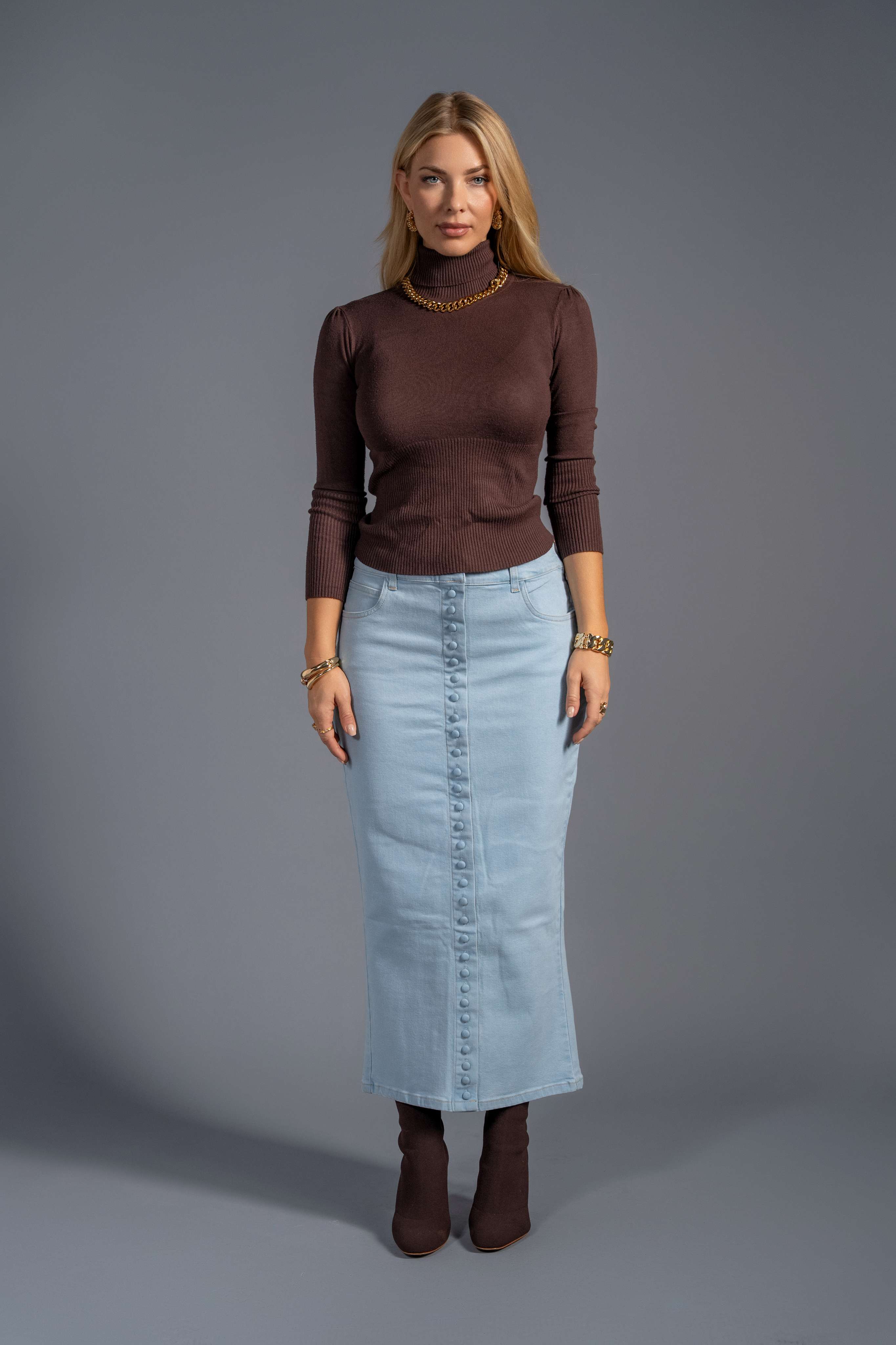 The Sky Blue Stretch Denim Skirt moves with quiet confidence; a soft silhouette shaped from exquisite Peruvian stretch denim in a serene sky-blue wash. Designed for comfort, structure, and timeless wear, it features a concealed side zipper for ease and a smooth fit. Its buttons are for decorative purposes only, ensuring modesty with intention. A seasonless piece for the woman who rebuilds herself with softness and strength, moving through the world with effortless poise.