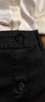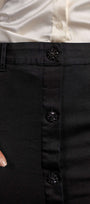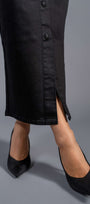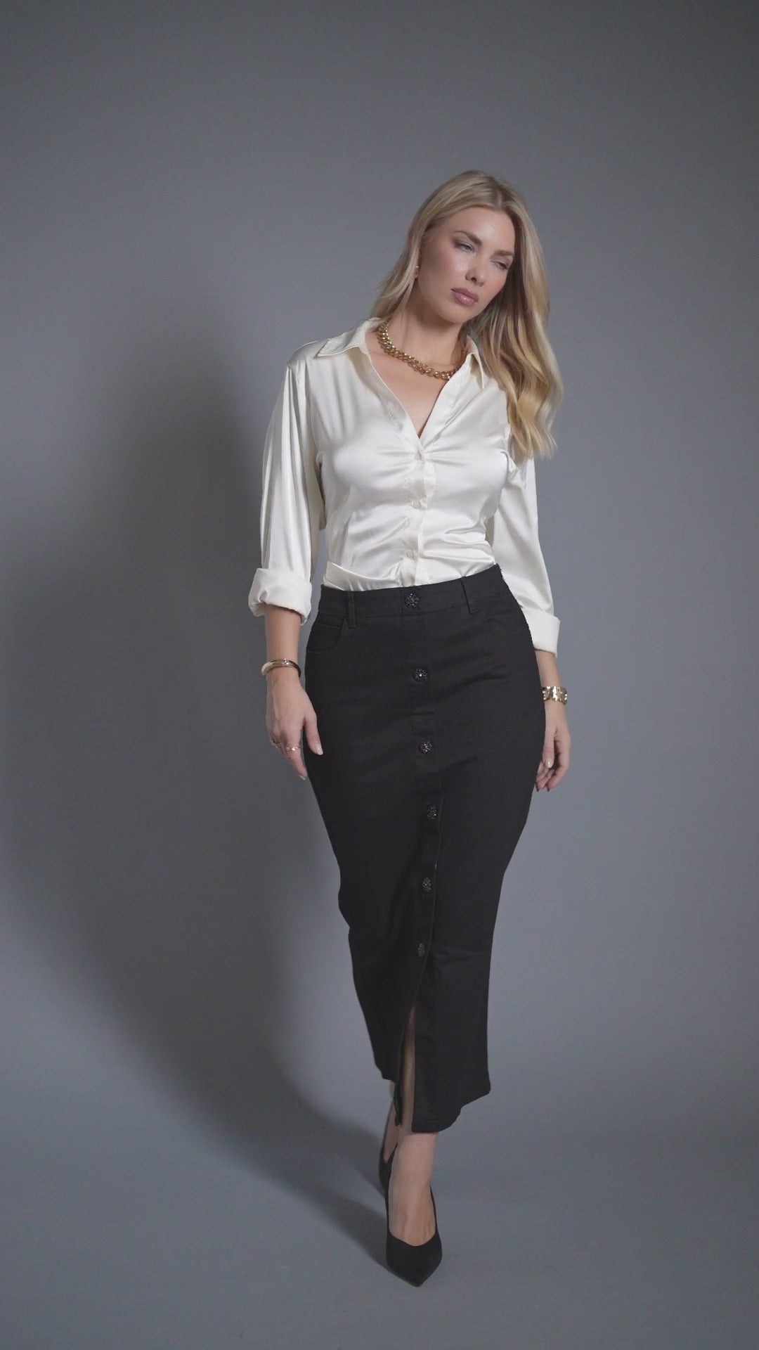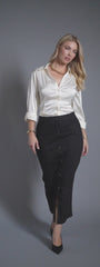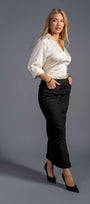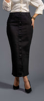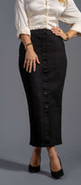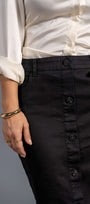Crafted from rich black Peruvian Cotton stretch denim, the Black Diamond Skirt embodies understated power. Its silhouette holds form without rigidity, moving as you move: grounded, poised, unshaken. A side zipper ensures a seamless fit, while decorative buttons glint softly along the front, a quiet detail that symbolizes strength polished by experience. A wardrobe constant for the woman who wears her resilience with elegance.