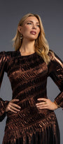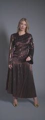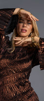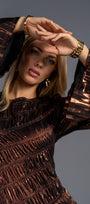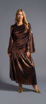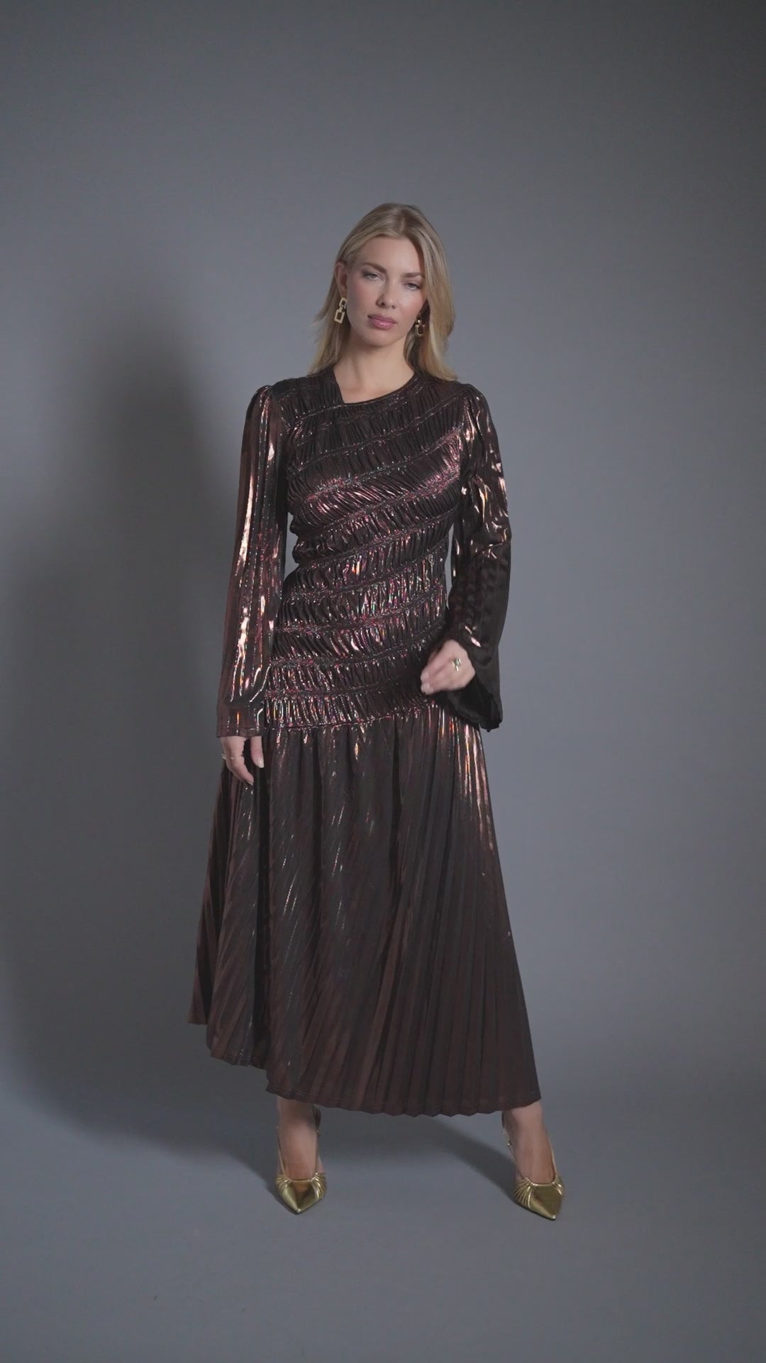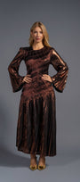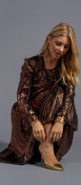 The Penny Dress shimmers in bronze and copper pleats that catch the light like poured metal, moving with a quiet grace that reflects the soft returning of one’s own power. The bodice contours the form with quiet assurance, echoing a resilience that no longer needs to prove itself. Inspired by Kintsugi, it honors every chapter that shaped you, and the radiance reclaimed on the other side. This is not just a dress; it is a recognition of self: I have healed. I have risen. I deserve to shine.
