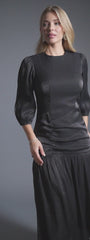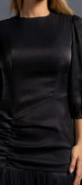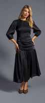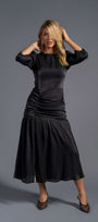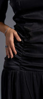 The Shevin Dress is the art of quiet power. Its black satin canvas doesn’t chase attention; it owns it through effortless poise. The soft drape and gathered waist create movement with intention, every line a study in balance and strength. Understated yet unforgettable, this is elegance that lingers long after you’ve left the room.